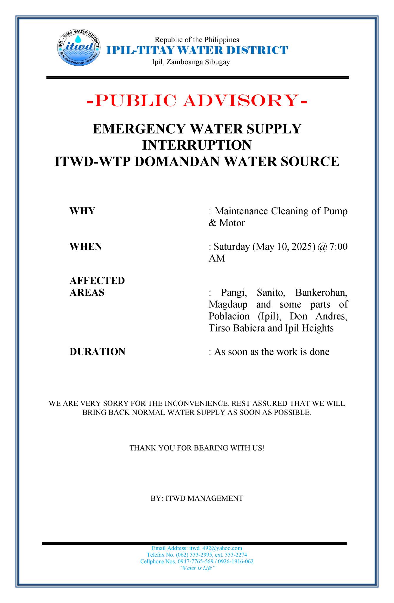 EMERGENCY WATER SERVICE INTERRUPTIONITWD-WTP (DOMANDAN)WHY: Maintenance Cleaning of Pump and MotorWHEN: Saturday (May 10, 2025) @ 7:00 AMAFFECTED AREAS: Pangi, Sanito, Bangkerohan, Magdaup, and some parts of Poblacion (Ipil), Don Andres, Tirso Babiera and Ipil Heights.DURATION: As soon as the work is done.We urge all residents to store an adequate amount of water for daily continue reading : -PUBLIC ADVISORY- (May 08, 2025)