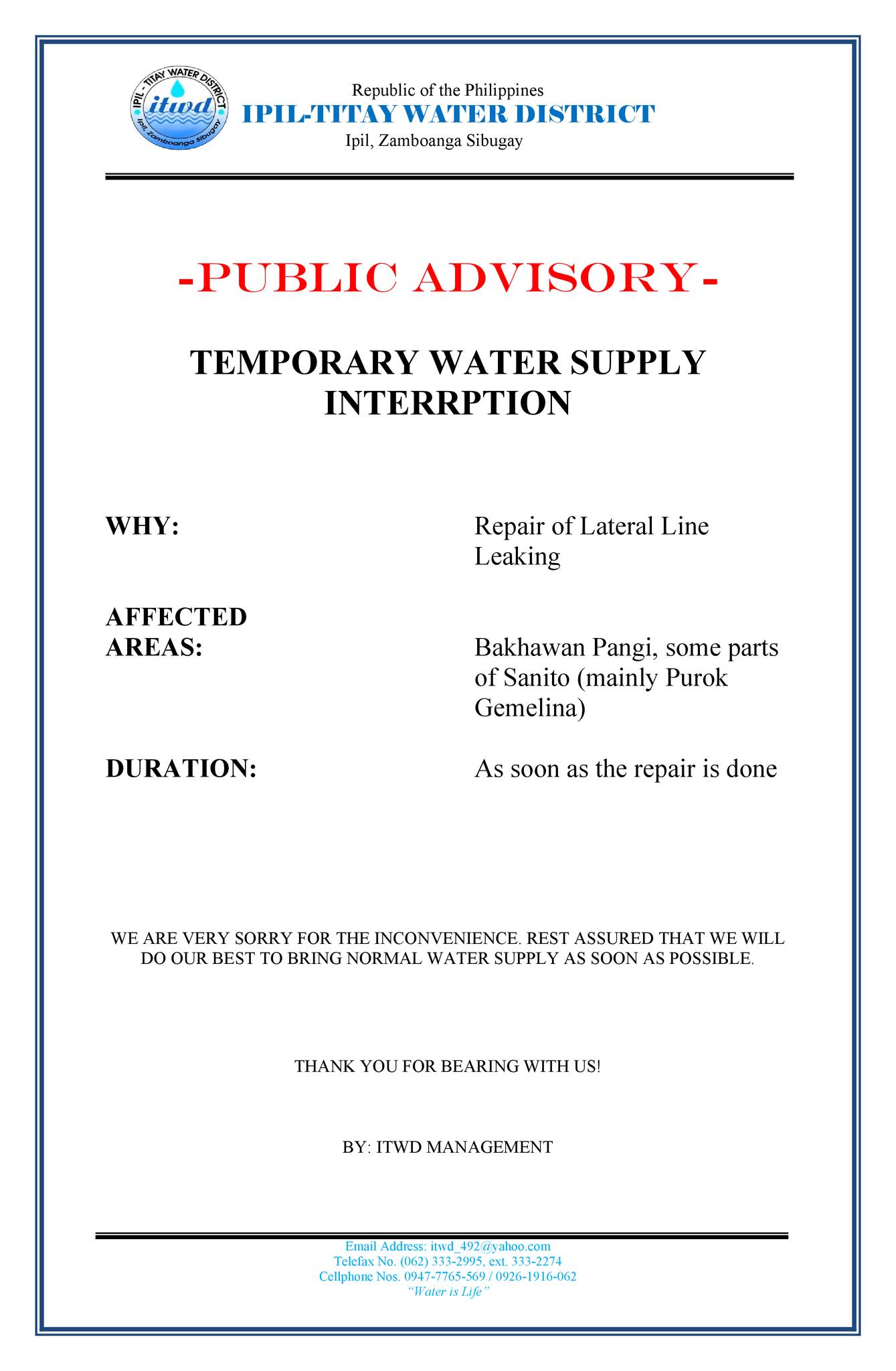 TEMPORARY WATER SUPPLY INTERRPTION WHY: Repair of Lateral Line Leaking AFFECTED AREAS: Bakhawan Pangi, some parts of Sanito (mainly Purok Gemelina) DURATION: As soon as the repair is done Rest assured that we will do our best to bring back normal water supply as soon as possible. If you have any concerns, you may contact continue reading : -PUBLIC ADVISORY- (January 8, 2025)