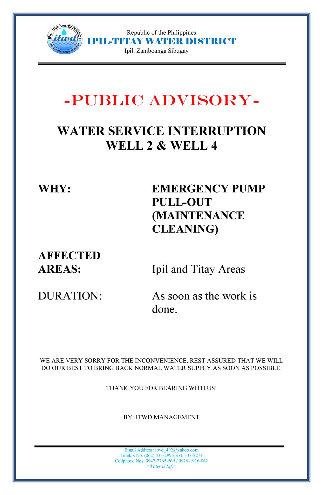 WATER SERVICE INTERRUPTION WELL 2 & WELL 4WHY: EMERGENCY PUMP PULL-OUT (MAINTENANCE CLEANING)AFFECTED AREAS: Ipil and Titay AreasDURATION: As soon as the work is done.Rest assured that we will do our best to bring back normal water suply as soon as possible.If you have any concerns, you may contact us directly to this number 0997-476-7518.Thank continue reading : -PUBLIC ADVISORY- (October 10, 2024)