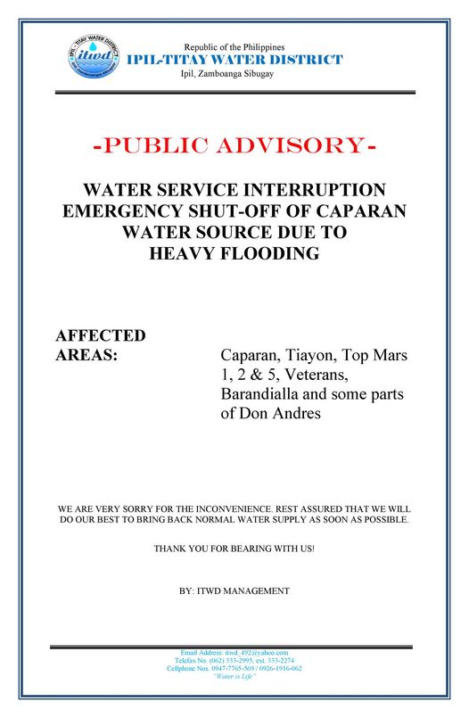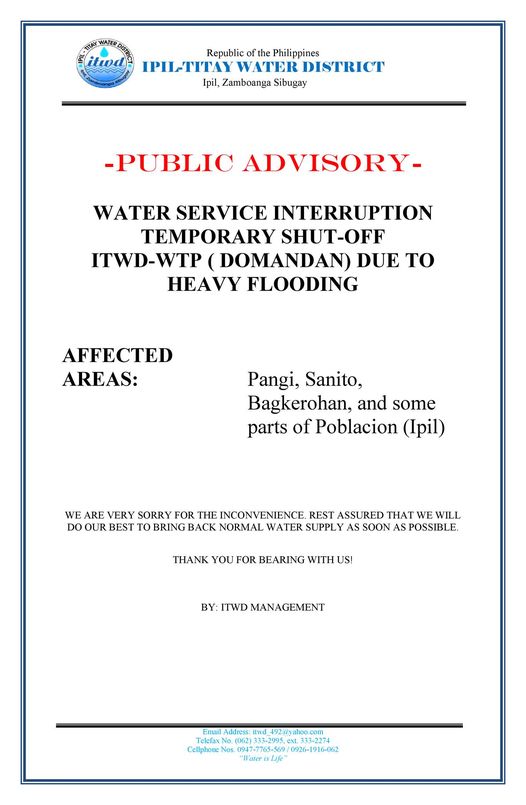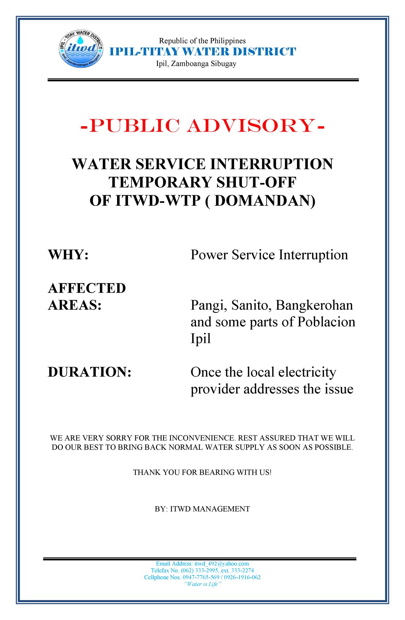 WATER SERVICE INTERRUPTION TEMPORARY SHUT-OFF OF ITWD-WTP ( DOMANDAN) WHY: Power Service Interruption AFFECTED AREAS: Pangi, Sanito, Bangkerohan and some parts of Poblacion Ipil DURATION: Once the local electricity provider addresses the issue Rest assured that we will do our best to bring back normal water supply as soon as possible. If you have any continue reading : -PUBLIC ADVISORY- (October 01, 2024)