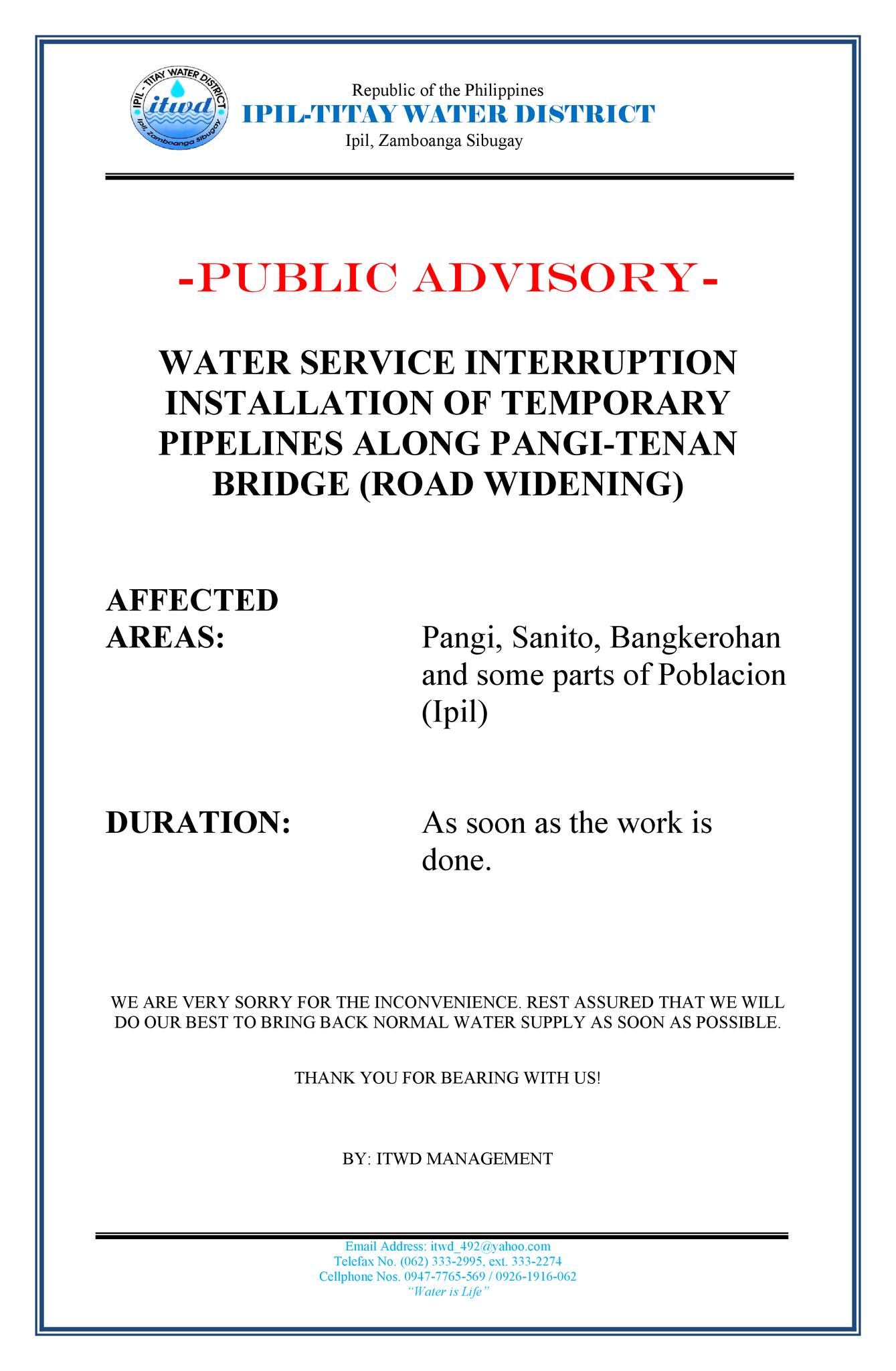 WATER SERVICE INTERRUPTION INSTALLATION OF TEMPORARY PIPELINES ALONG PANGI-TENAN BRIDGE (ROAD WIDENING)AFFECTED AREAS: Pangi, Sanito, Bangkerohan and some parts of Poblacion (Ipil)DURATION: As soon as the work is done.Rest assured that we will do our best to bring back normal water suply as soon as possible.If you have any concerns, you may contact us directly continue reading : -PUBLIC ADVISORY- (October 15, 2024)