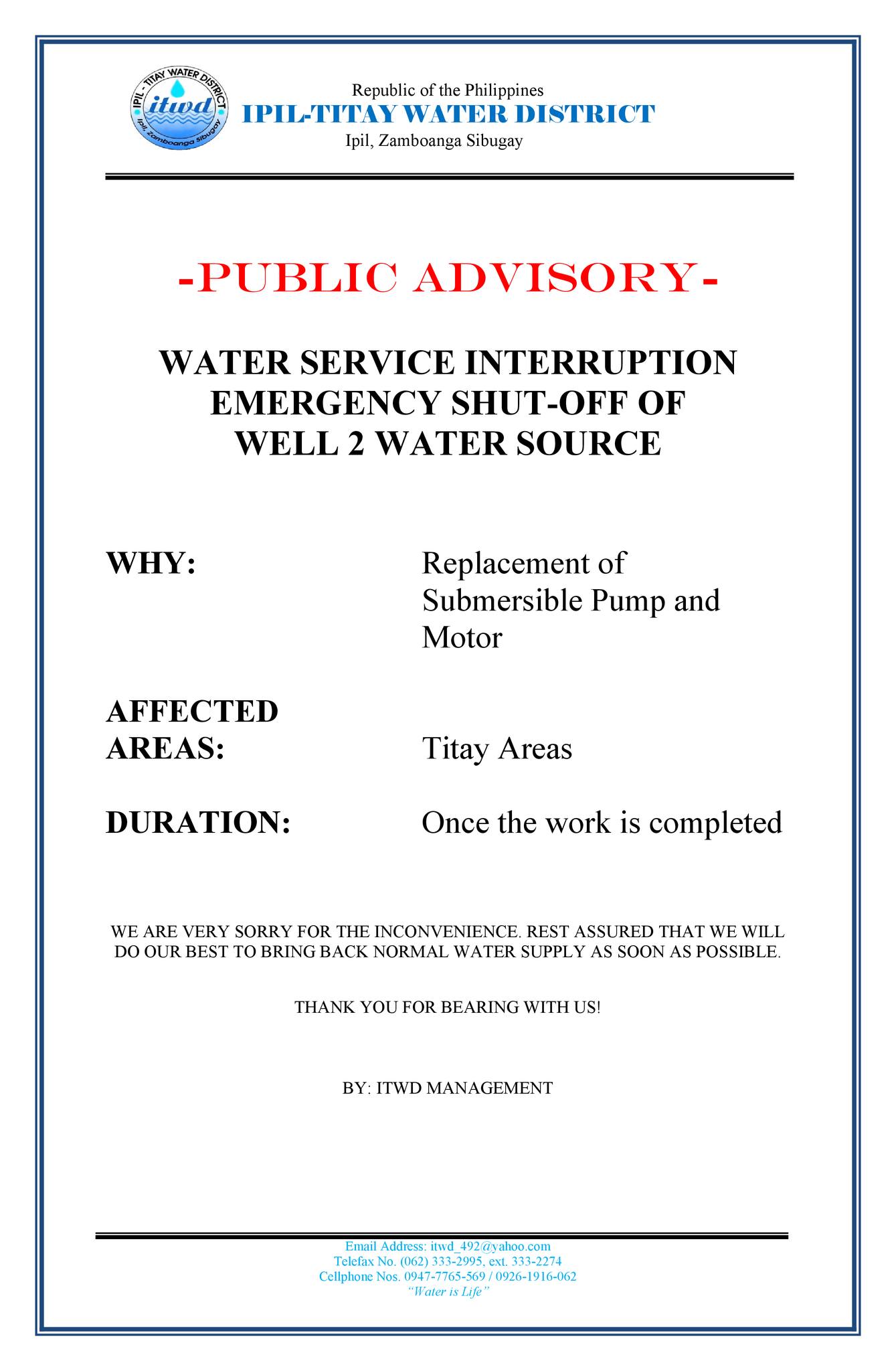 WATER SERVICE INTERRUPTION EMERGENCY SHUT-OFF OF WELL 2 WATER SOURCEWHY: Replacement of Submersible Pump and MotorAFFECTED AREAS: Titay AreasDURATION: Once the work is completedRest assured that we will do our best to bring back normal water suply as soon as possible.If you have any concerns, you may contact us directly to this number 0997-476-7518.Thank you continue reading : -PUBLIC ADVISORY- (October 01, 2024)