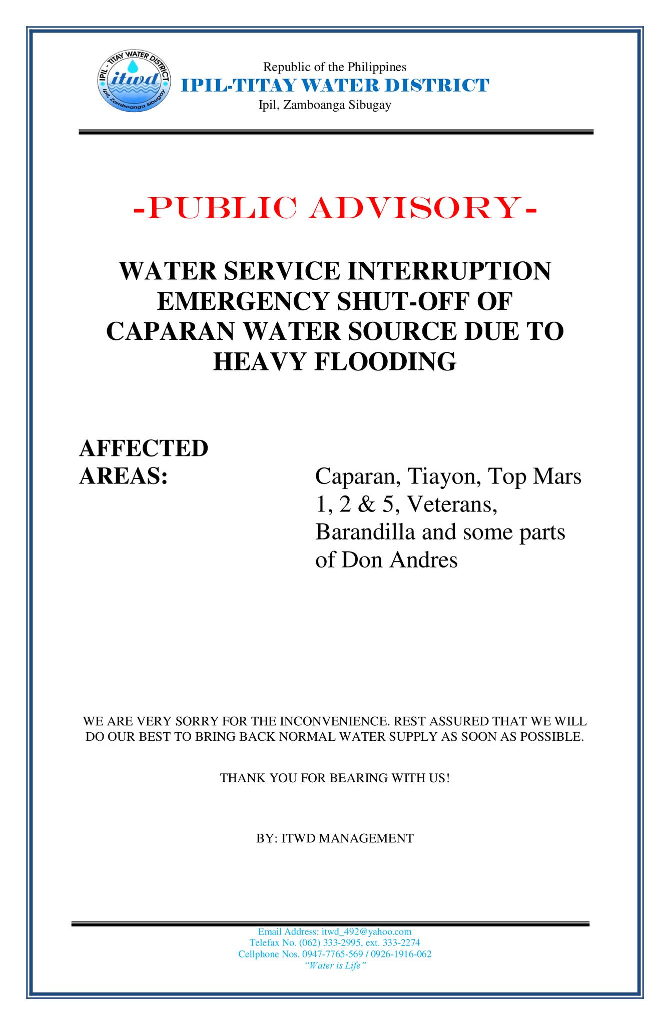 WATER SERVICE INTERRUPTION EMERGENCY SHUT-OFF OF CAPARAN WATER SOURCE DUE TO HEAVY FLOODING AFFECTED AREAS: Caparan, Tiayon, Top Mars 1, 2 & 5, Veterans, Barandialla and some parts of Don Andres Rest assured that we will do our best to bring back normal water suply as soon as possible. If you have any concerns, you continue reading : -PUBLIC ADVISORY- (October 22, 2024)