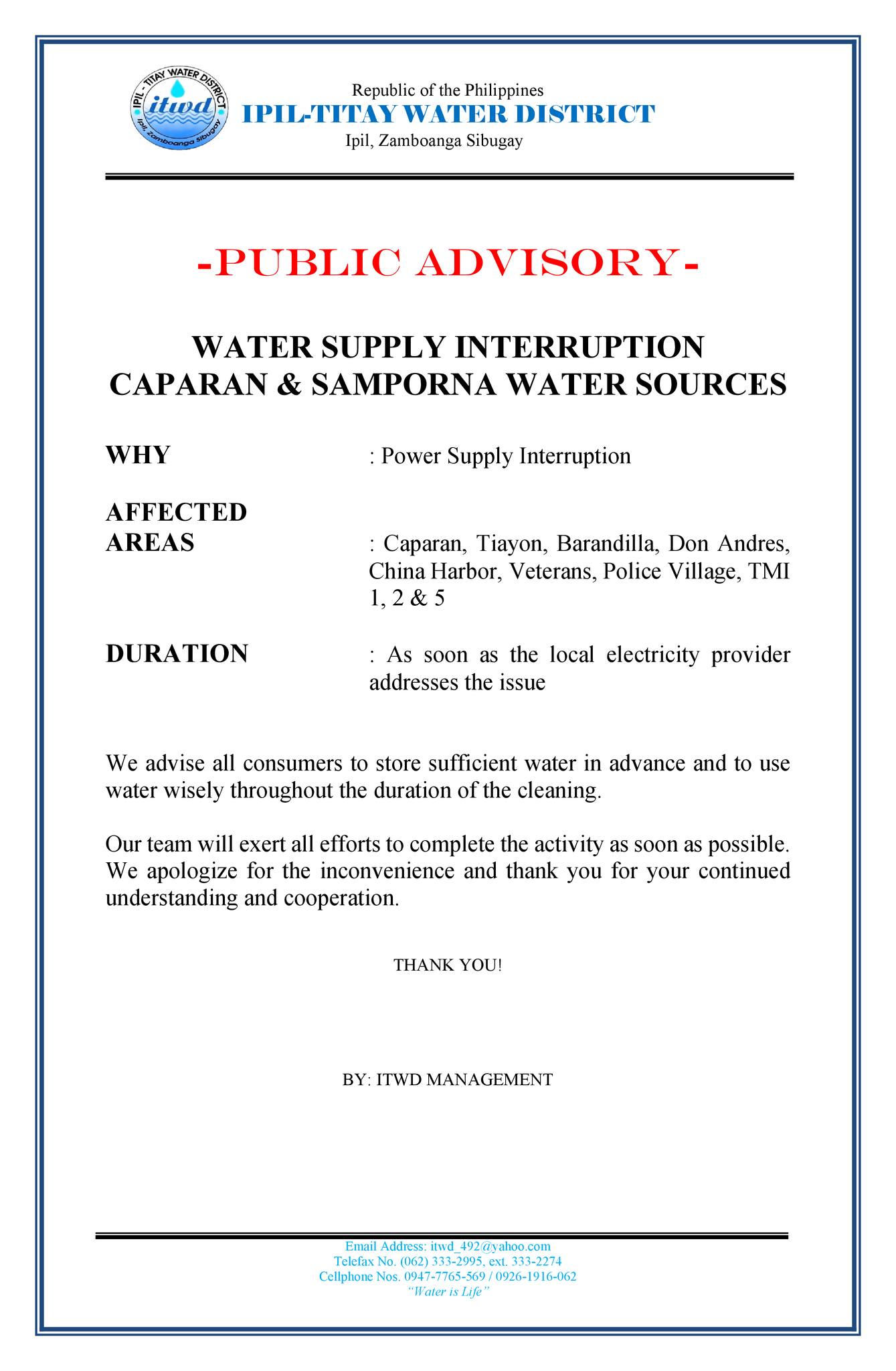 WATER SUPPLY INTERRUPTION CAPARAN & SAMPORNA WATER SOURCES WHY: Power Supply Interruption AFFECTED AREAS : Caparan, Tiayon, Barandilla, Don Andres, China Harbor, Veterans, Police Village, TMI 1, 2 & 5 DURATION: As soon as the local electricity provider addresses the issue We advise all consumers to store sufficient water in advance and to use water continue reading : -PUBLIC ADVISORY- (October 20, 2025)