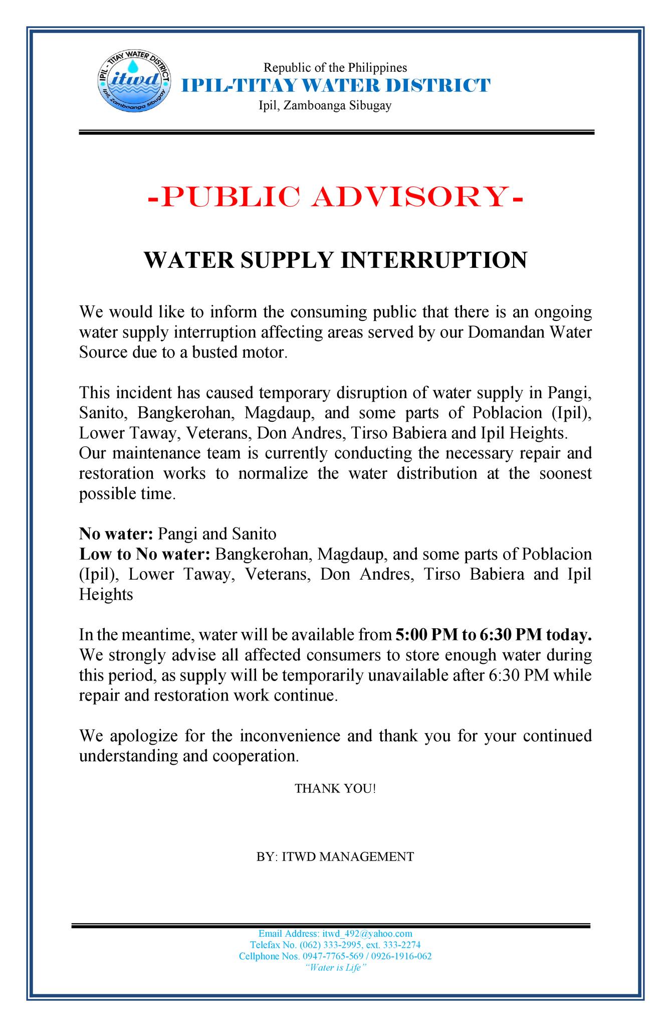WATER SUPPLY INTERRUPTION DOMANDAN WATER SOURCE(ITWD-WTP) WHY : POWER SUPPLY INTERRUPTION AFFECTED AREAS: Pangi, Sanito, Bangkerohan, Magdaup, and some parts of Poblacion (Ipil), Lower Taway, Veterans, Don Andres, Tirso Babiera and Ipil Heights. DURATION: As soon as the work is done. We advise all consumers to store sufficient water in advance and to use water continue reading : -PUBLIC ADVISORY- (October 27, 2025)