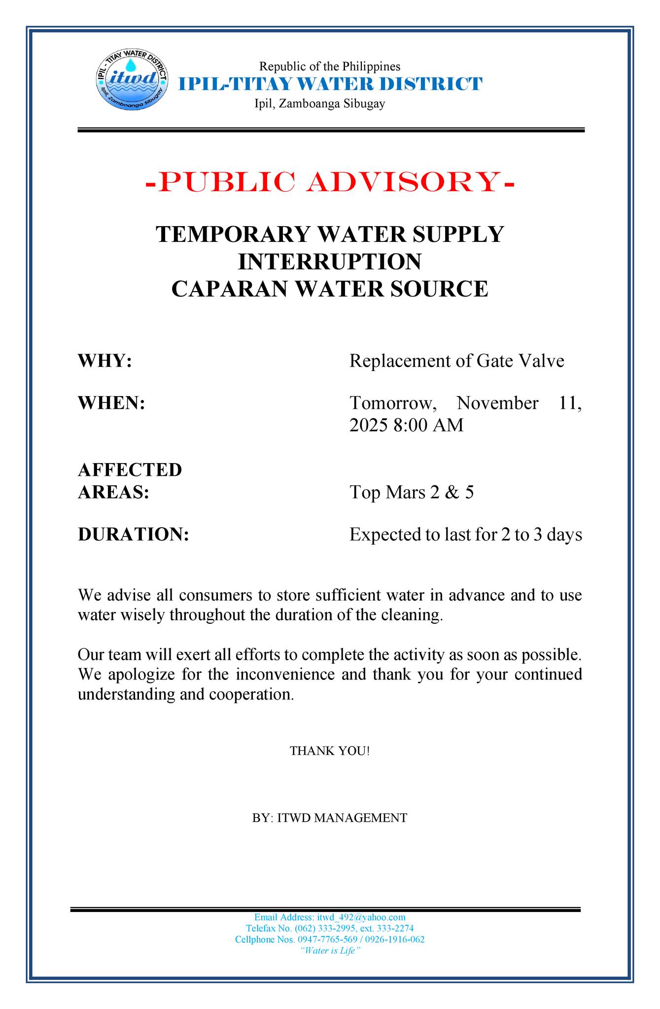WATER SUPPLY INTERRUPTION DOMANDAN WATER SOURCE(ITWD-WTP) WHY: Maintenace Cleaning AFFECTED AREAS: Pangi, Sanito, Bangkerohan, Magdaup, and some parts of Poblacion (Ipil), Taway, Veterans, Don Andres, Tirso Babiera and Ipil Heights. You may experience low to no water supply. DURATION: As soon as the work is done. We advise all consumers to store sufficient water in continue reading : -PUBLIC ADVISORY- (November 8, 2025)